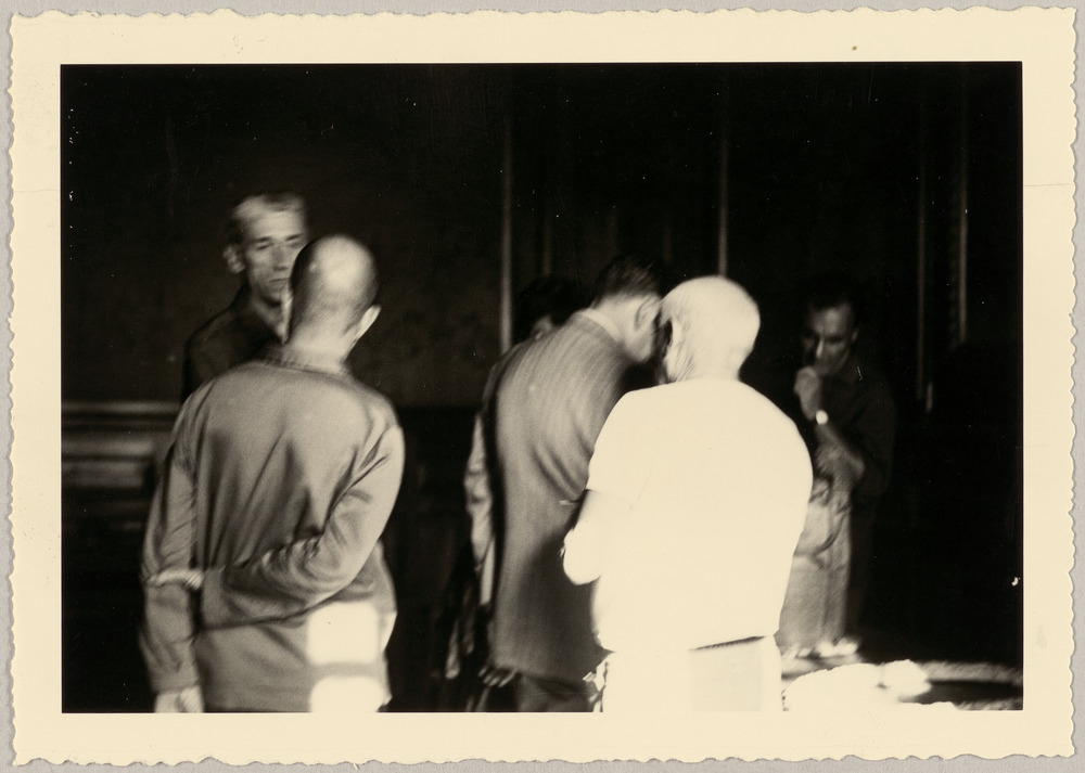 Michel Leiris et Pablo Picasso de dos avec Gabriel Melguizo Gutiérrez et des amis au Château de Vauvenargues, début années 1960