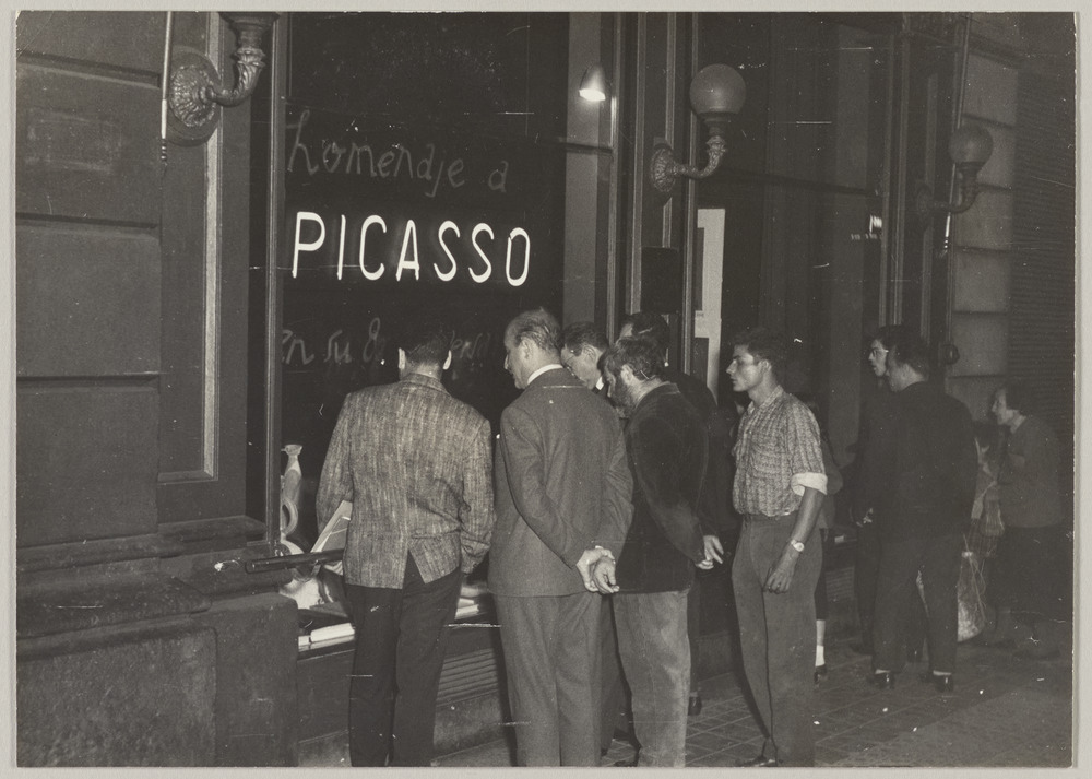 Miquel Gaspar, Joan Vilacasas et Joan Gaspar de dos devant la vitrine de la Sala Gaspar à Barcelone en 1961 pour l'exposition-hommage des 80 ans de Picasso