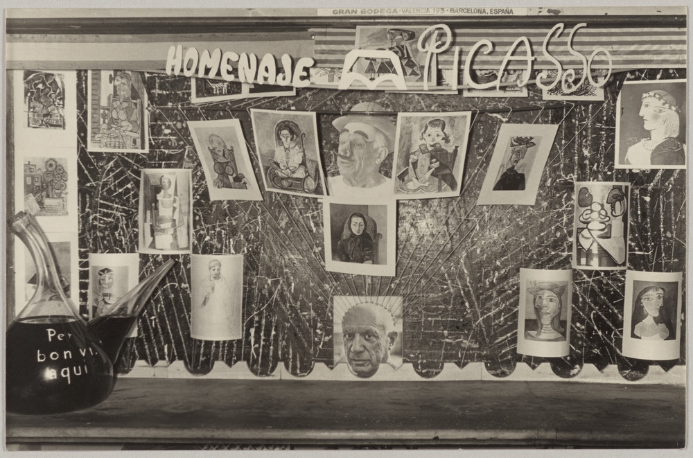 Montage "Homenaje A Picasso" avec des photographies de Pablo Picasso et de ses oeuvres à la Gran Bodega, à Barcelone, dans les [années 1960]