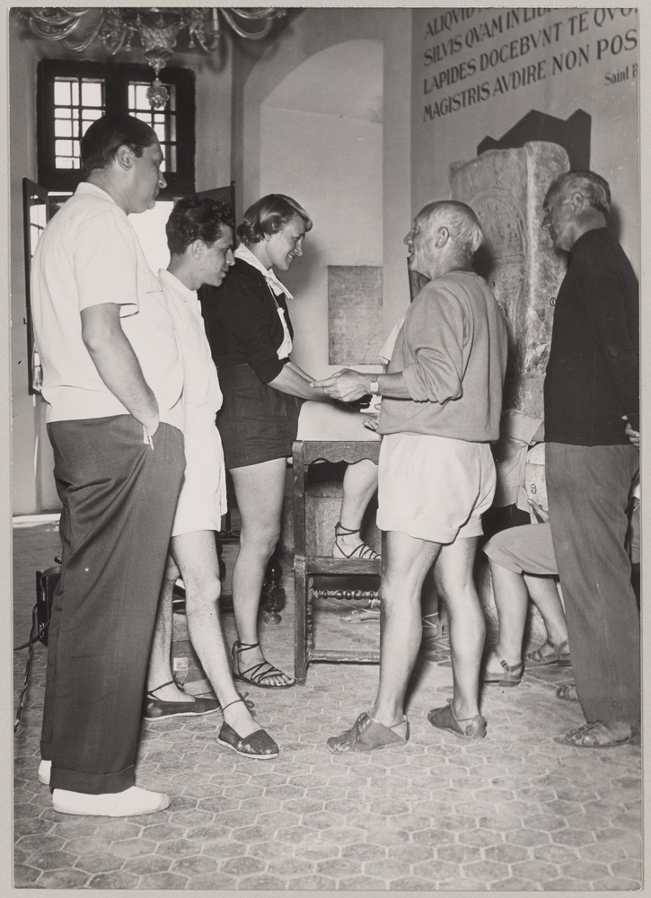 Nicole Védrès avec Pablo Picasso et Manuel Ángeles Ortiz dans une salle du château Grimaldi lors du tournage de la séquence 2 de "La vie commence demain" de Nicole Védrès, Antibes, en 1949