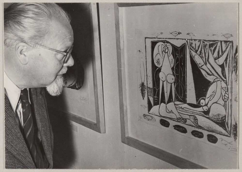 O. Kirchenrat devant une estampe présentée à l'exposition "Pablo Picasso" de Lübeck, en juillet-août 1949