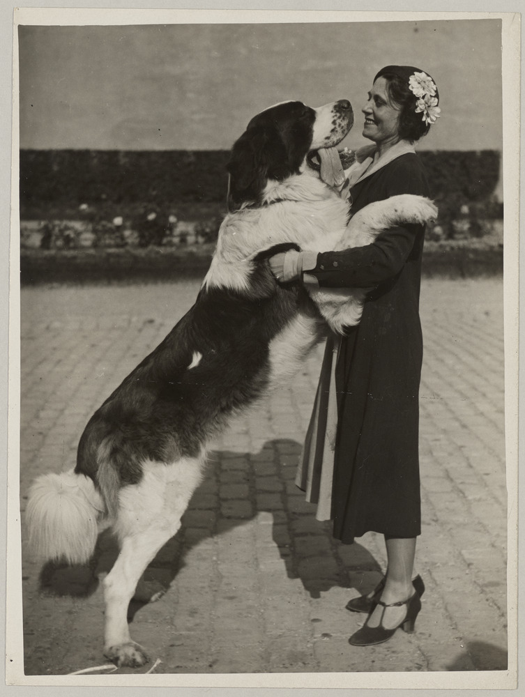 Olga Picasso avec Bob, le chien des pyrénées, dans le parc de Boisgeloup, Gisors, début des années 1930