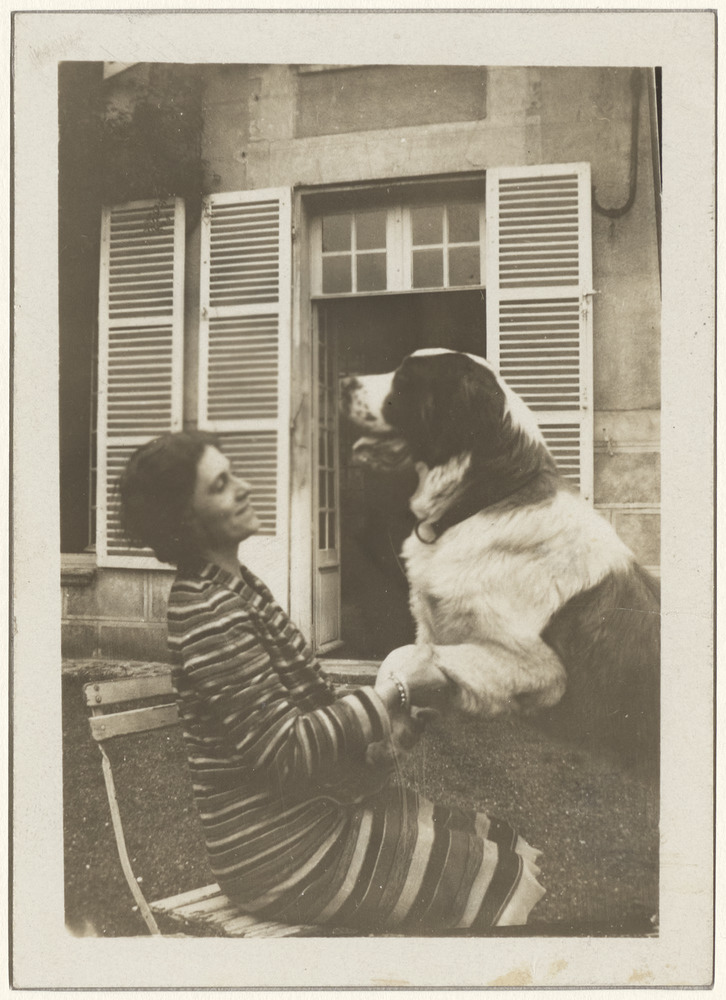 Olga Picasso avec Bob, le chien des Pyrénées devant le Château de Boisgeloup, Gisors, années 1930