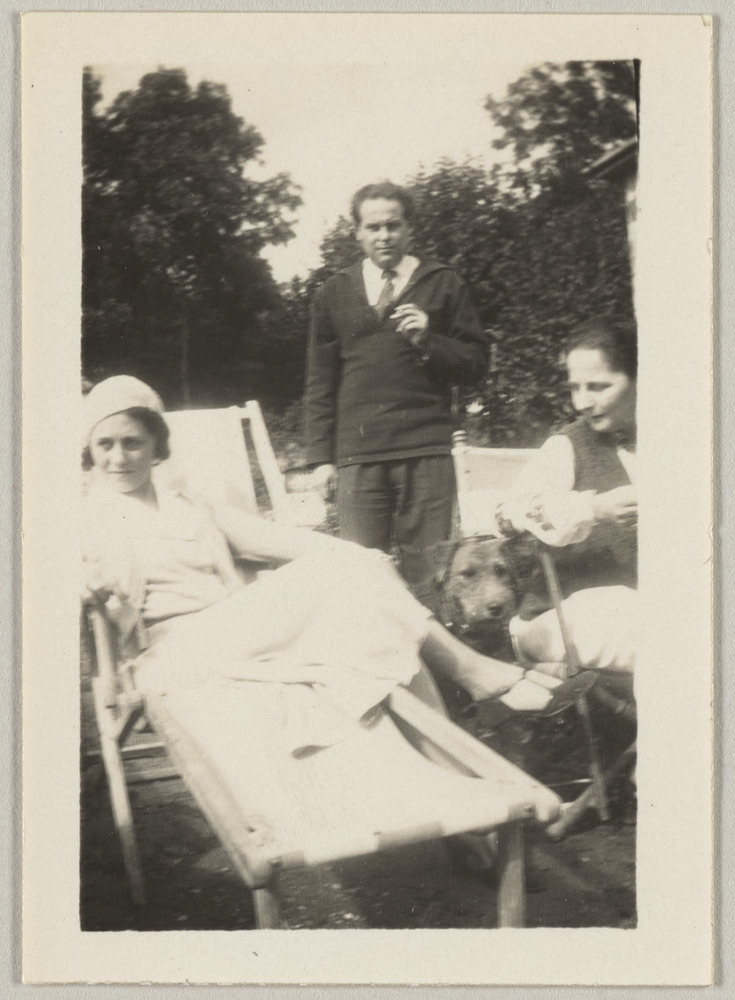 Olga Picasso avec Georges et Florence Maratier et Elfe le chien dans le jardin de Gertrude Stein et d'Alice Toklas, Bilignin, en été 1931