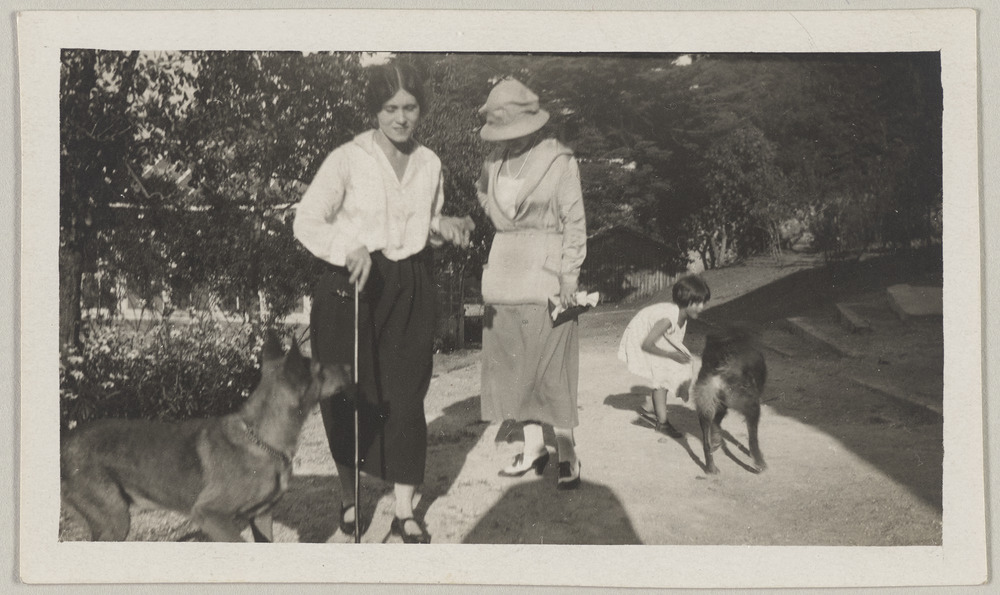 Olga Picasso avec une femme, une petite fille et deux chiens, sur la terrasse de la villa du 33 boulevard du Général Leclerc, Fontainebleau, pendant l'été 1921