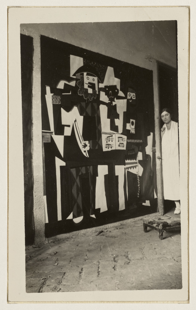 Olga Picasso à côté de l'huile sur toile "Les trois musiciens" en cours d'exécution, au 33 boulevard du Général Leclerc, Fontainebleau, en septembre 1921