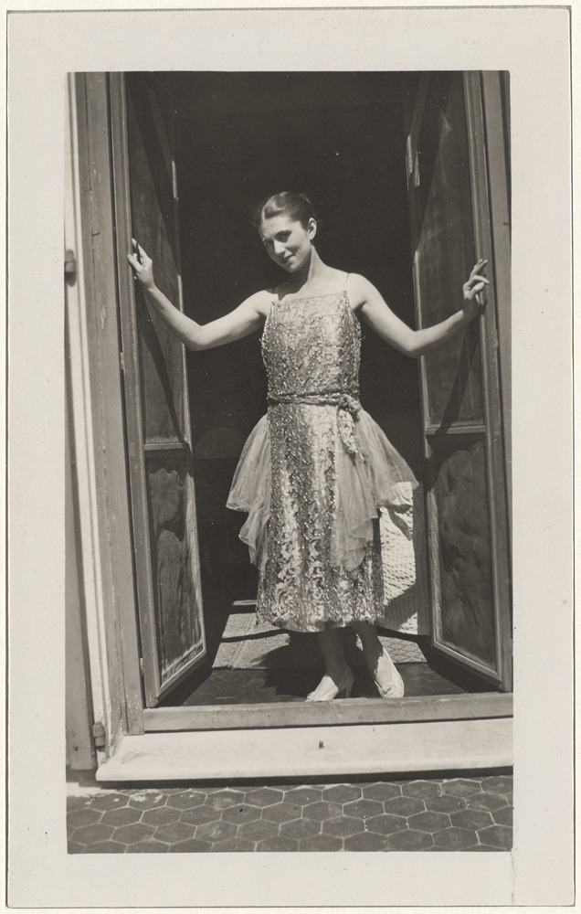 Olga Picasso en robe de soirée dans l'encadrement de la porte-fenêtre, à la Villa Les Sables, Juan-les-Pins, été 1920