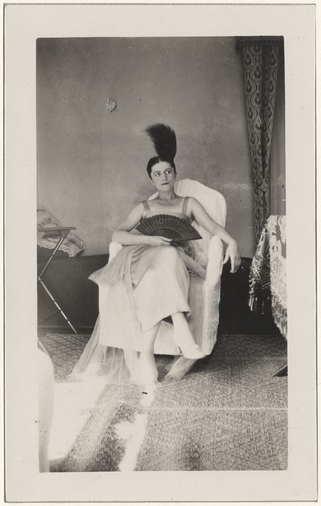 Olga Picasso en robe de soirée dans un fauteuil, à la Villa Les Sables, Juan-les-Pins, été 1920