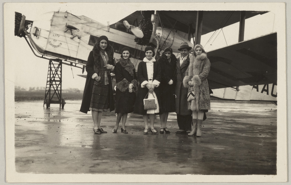 Olga Picasso entourée d'Alexandrine Troussevitch, Alice Nikitina, Lubov Tchernicheva, Ludmilla Schollar et de Serge Lifar posant devant l'avion Armstrong Whitworth Argosy II "City of Edinburgh" au Musée de l'Air et l'Espace, Meudon, circa 1930