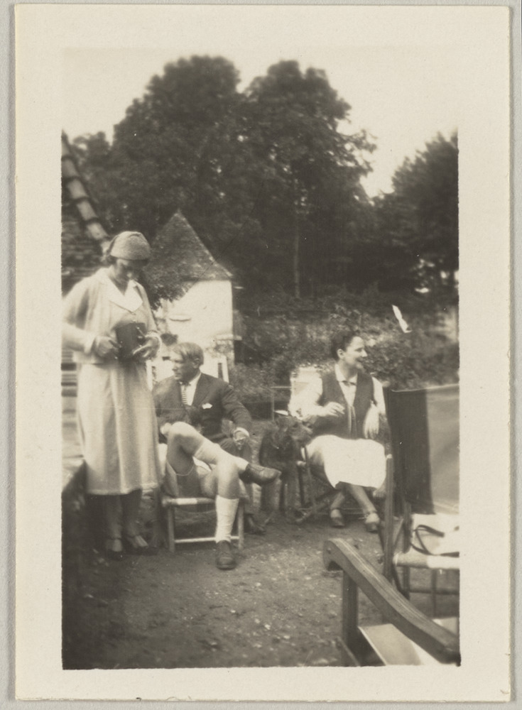 Olga Picasso manipulant un appareil photo à côté de son mari et de Florence Maratier dans le jardin de Gertrude Stein et d'Alice Toklas, Bilignin, en été 1931