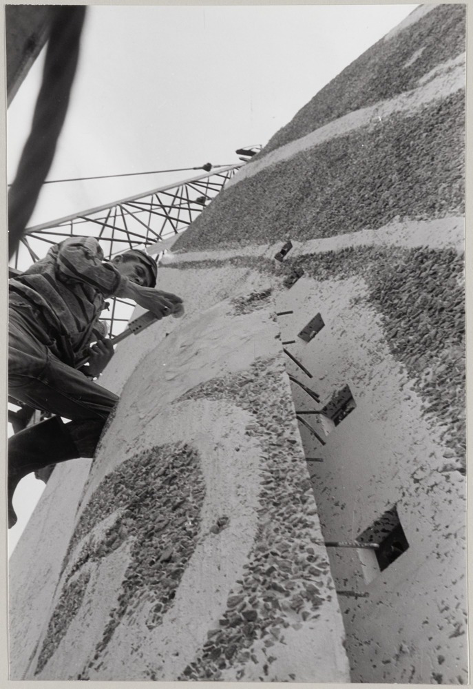 Ouvrier intervenant sur la sculpture en bétogravure "Tête de femme", Kristinehamn, Lac de Vänern, Suède, en 1965