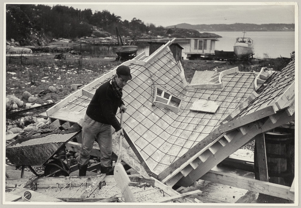 Ouvrier repartissant le béton dans le coffrage d'une des sculptures du groupe du "Le déjeuner sur l'herbe", en 1965-66