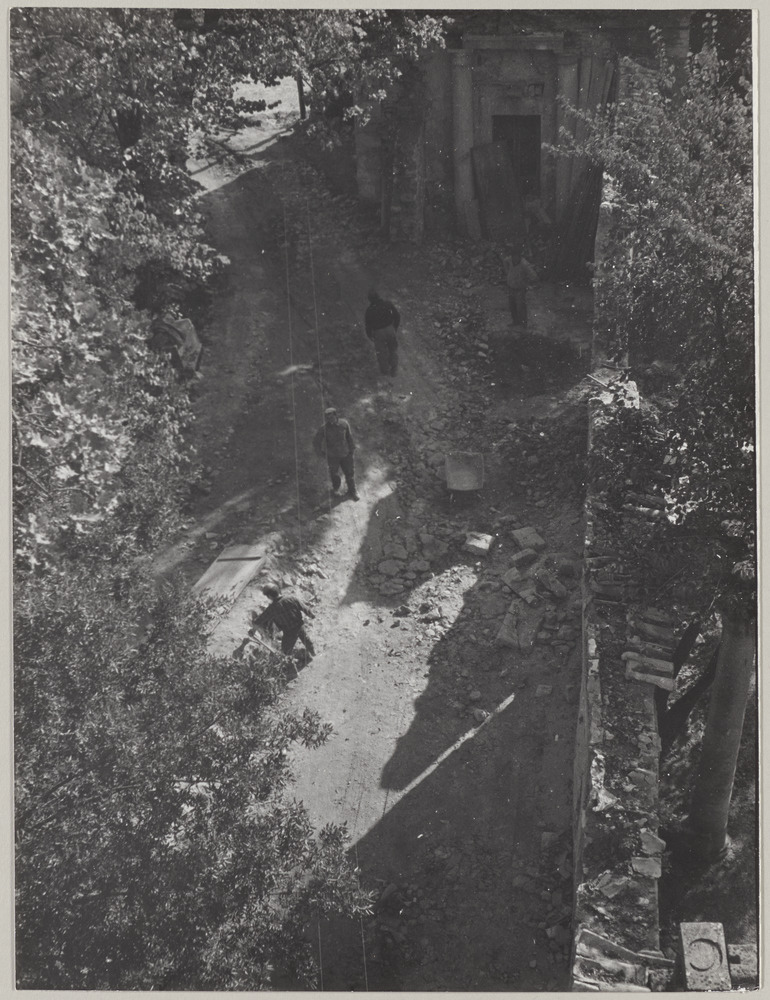 Ouvriers près du mur longeant [le billard], chantier du mur du château de…
