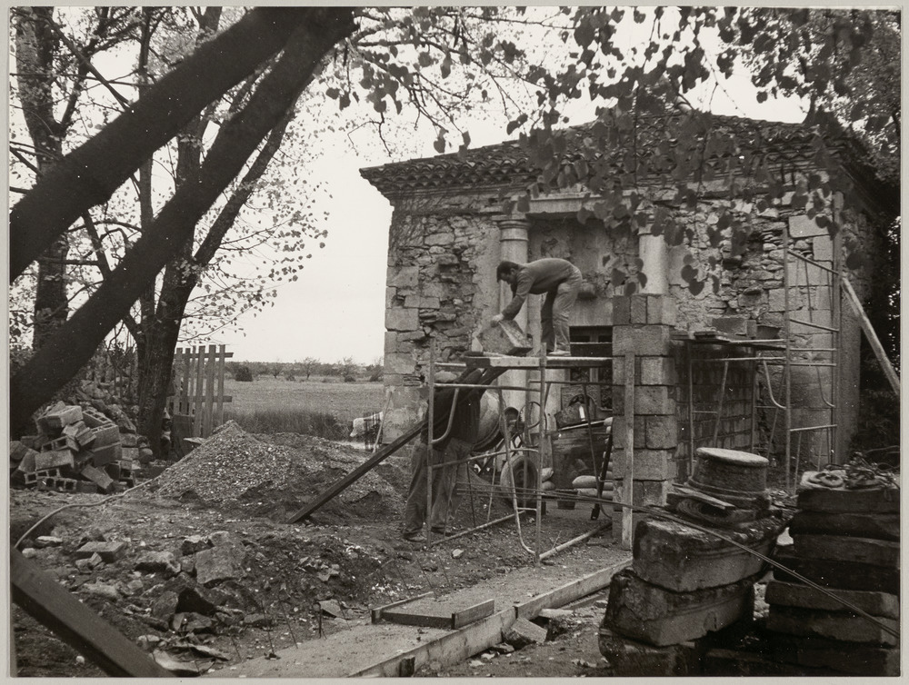 Ouvriers sur le chantier du mur du château de Castille, propriété de Douglas Cooper, Rémoulins, en 1963