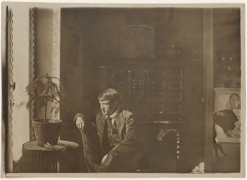 Pablo Picasso assis dans l'atelier de la rue Schoelcher, Paris, en 1914-15