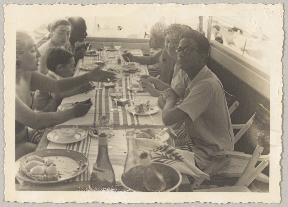 Pablo Picasso attablé avec ses enfants Paloma, Claude et Maya, Jacqueline Roque et des amis au restaurant à côté de la plage de la Garoupe, Antibes