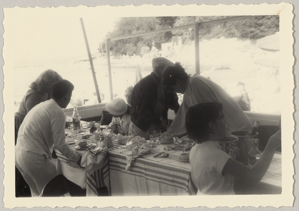 Pablo Picasso avec [Bettina Graziani], Véra Clouzot, Maya Picasso, Jeanne de la Rochette dit Totote au restaurant, plage de la Garoupe, Antibes, en 1955