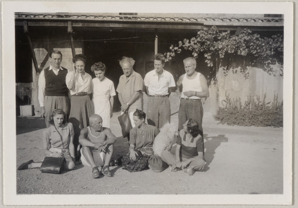 Pablo Picasso avec Brenda Rawnsley, Suzanne Ramié, [Victor Brauner], Françoise Gilot, Marcel Boudin et d'autres personnes non identifiées dans la cour de l'atelier Madoura, Vallauris, circa juin-début juillet 1948