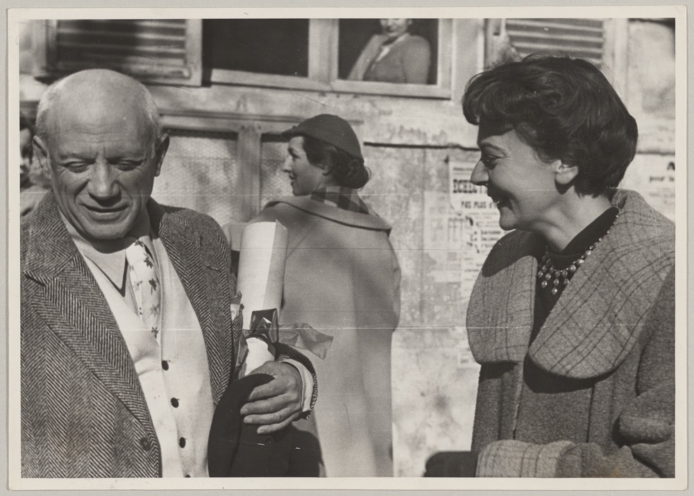 Pablo Picasso avec [Claire Vervin] et Françoise Gilot lors de la remise du diplôme de citoyen d'honneur de la ville de Vallauris, le 29 janvier 1950