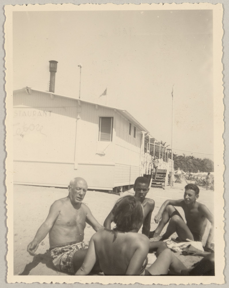 Pablo Picasso avec des jeunes gens sur la plage de Golfe-Juan, fin années 1940
