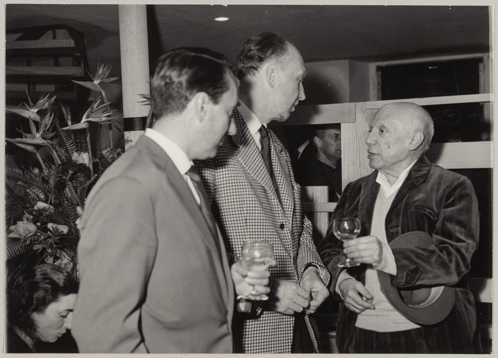Pablo Picasso avec deux hommes lors de l'inauguration de la galerie Madoura, Cannes, début 1961