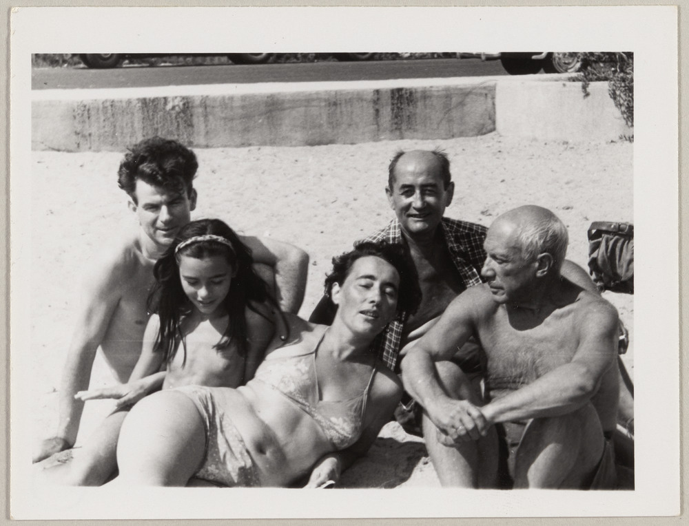 Pablo Picasso avec Dominique Eluard et sa fille Caroline Lemort et deux amis sur la plage de Golfe-Juan, été 1954