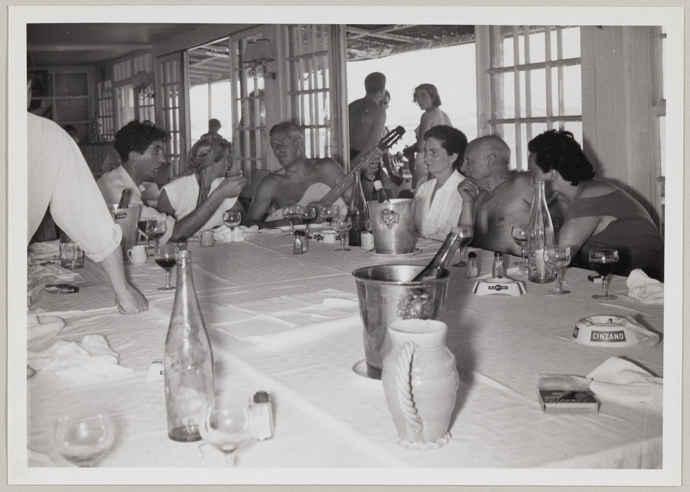 Pablo Picasso avec Dominique Eluard, Francisco Reina 'Minuni' et des amis au restaurant Nounou, plage de Golfe-Juan, été 1954