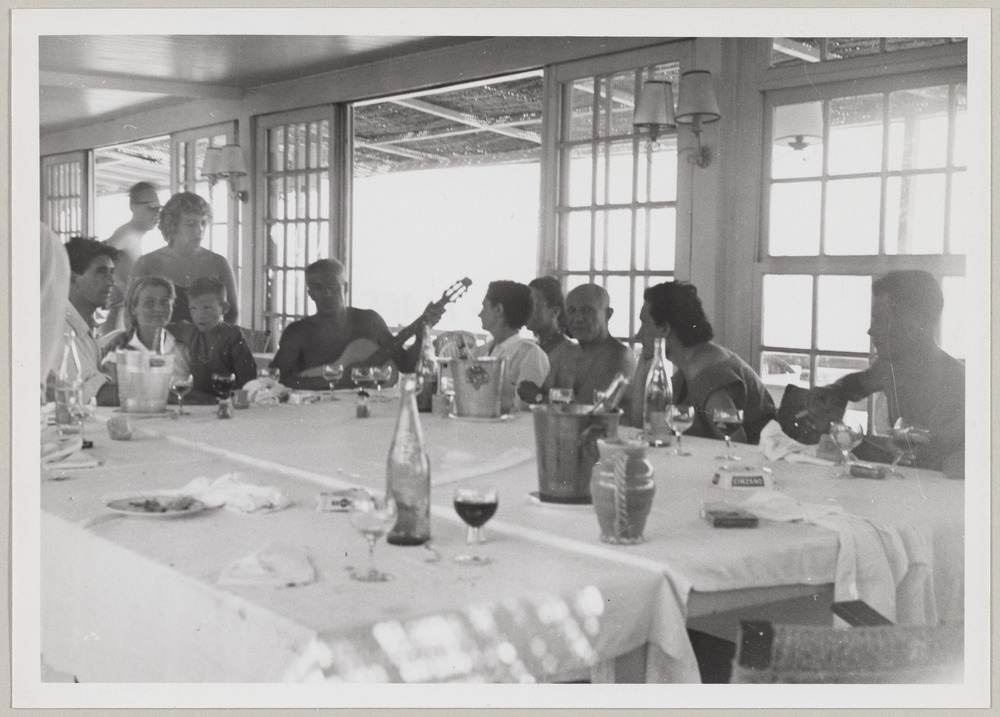 Pablo Picasso avec Dominique Eluard, Maya, Francisco Reina dit 'Minuni' et des amis au restaurant Nounou, plage de Golfe-Juan, été 1954