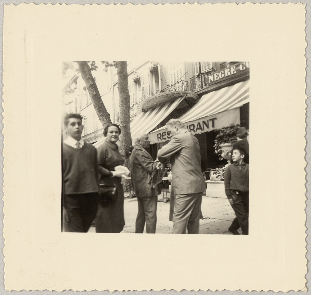 Pablo Picasso avec Edouard Pignon, Anna Maria Torra de Gili et un jeune garçon dans les rues de [Cannes], le 12 octobre 1958