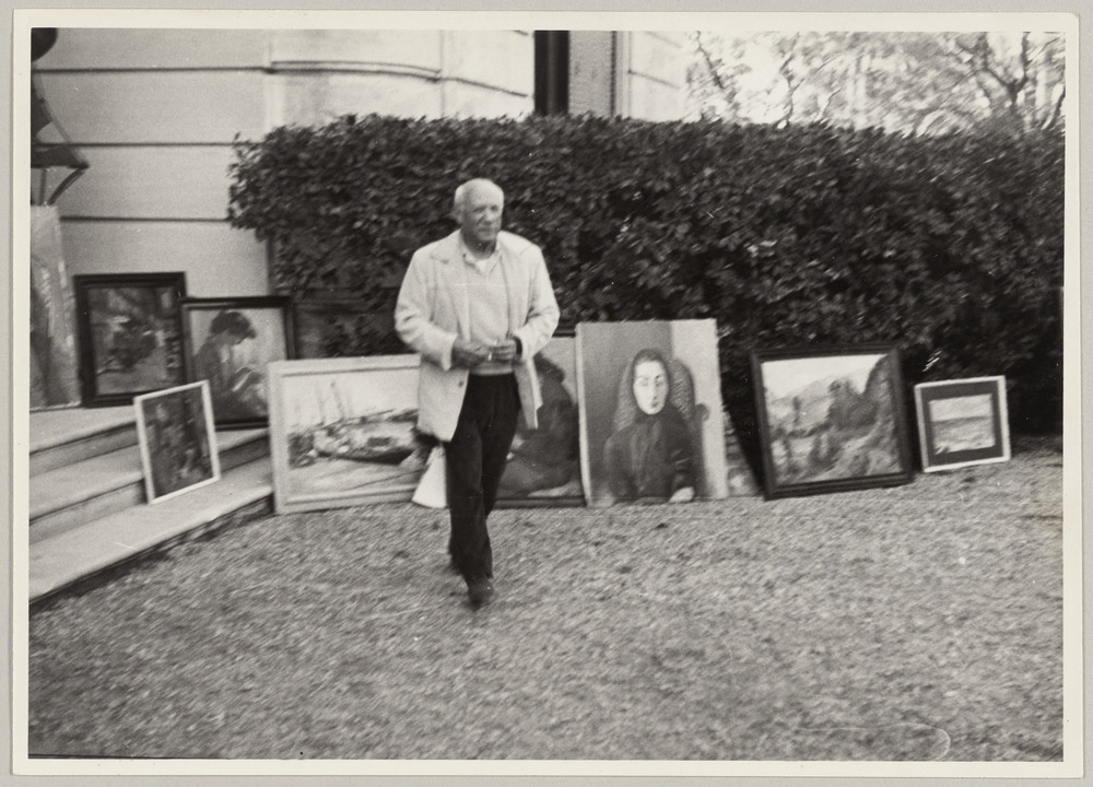 Pablo Picasso avec en arrière-plan l'huile sur toile "Jacqueline avec une écharpe noire" et d'autres toiles du "El grupo Malagueno" à l'entrée de la villa La Californie, Cannes, en [novembre] 1957