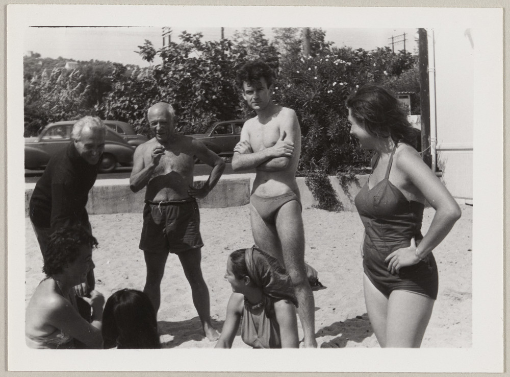 Pablo Picasso avec Françoise Gilot, Dominique Eluard et sa fille Caroline Lemort, Françoise Gilot, Manuel Ángeles Ortiz et un ami sur la plage de Golfe-Juan, été 1954