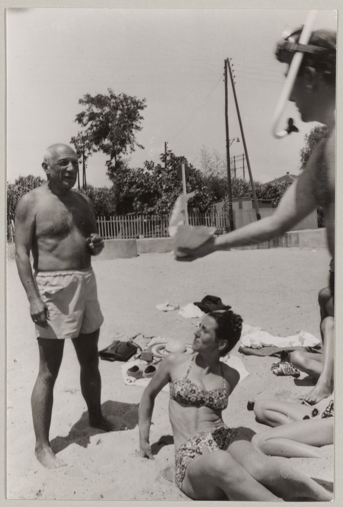Pablo Picasso avec Françoise Gilot et un ami au tuba sur la plage de Golfe-Juan, circa 1949-51