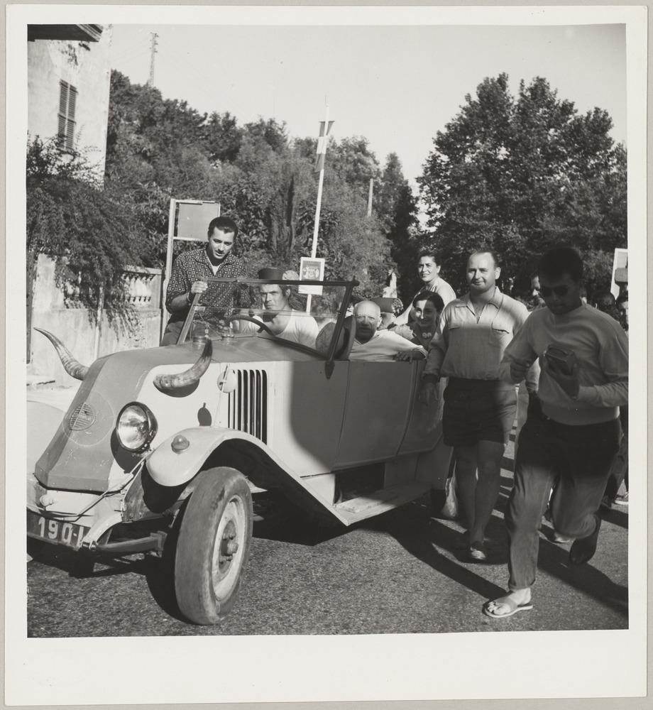 Rituel des années 1950 : défilé de Picasso le dernier dimanche d'août à la fin de la corrida de Vallauris. La voiture à cornes de taureau est au potier et sculpteur Gilbert Valentin, qui a un atelier "Les archanges" avec sa femme près du chemin du Fournas. Amis de Picasso.