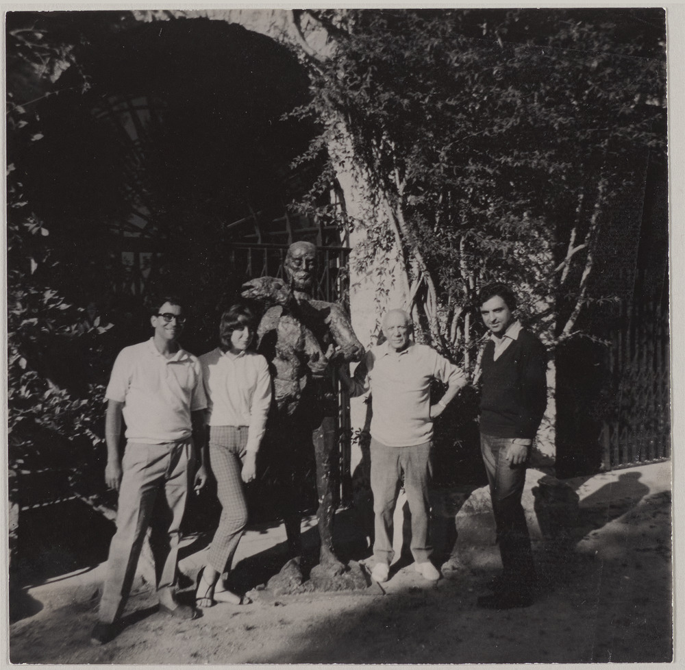 Pablo Picasso avec Guy et Mina Texidor et un ami autour du bronze "L'Homme au…