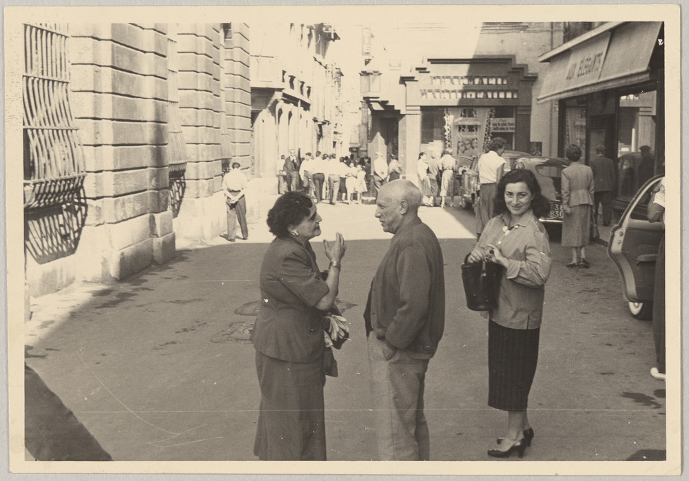 Pablo Picasso avec Jacqueline Roque et une femme dans la rue