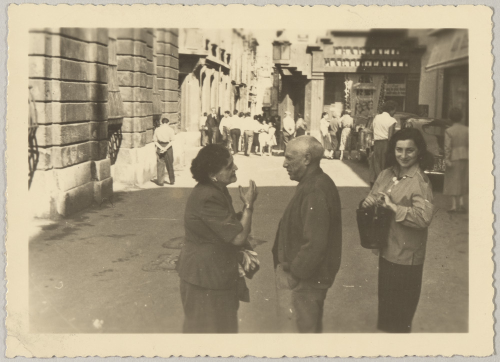 Pablo Picasso avec Jacqueline Roque et une femme non identifiée dans la rue