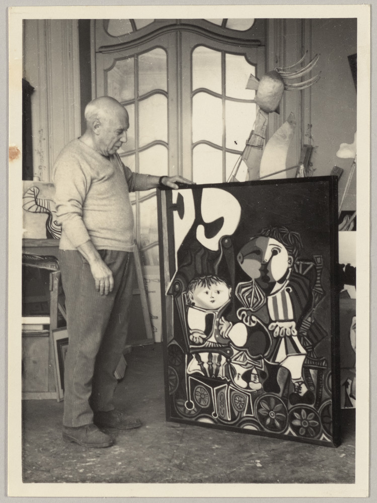 Pablo Picasso avec la toile "Claude et Paloma" dans l'atelier de La Californie, Cannes