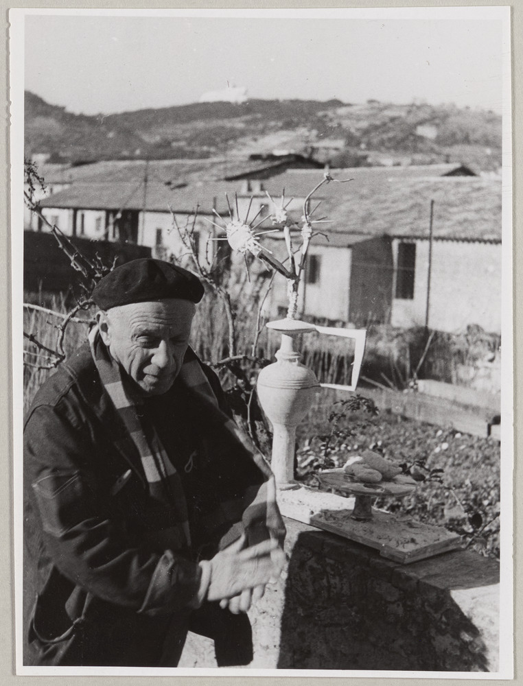 Pablo Picasso avec le plâtre "Nature morte au bouquet de fleurs" posé sur un muret dans la cour de l'atelier Madoura, Vallauris, en [1951]
