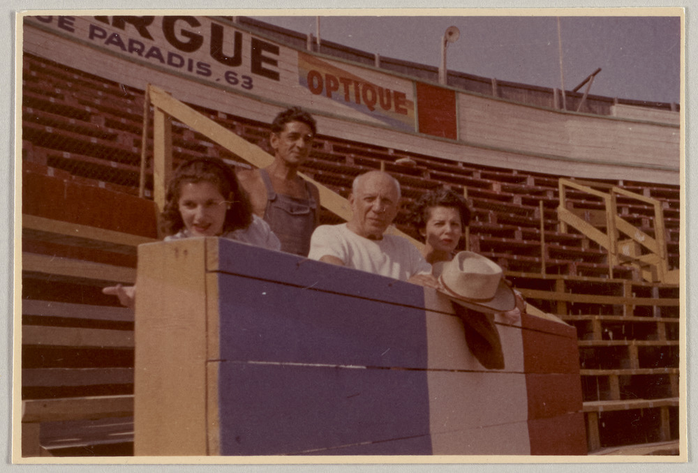 Pablo Picasso avec Margaret Silberman et sa fille Susan dans les tribunes des arènes