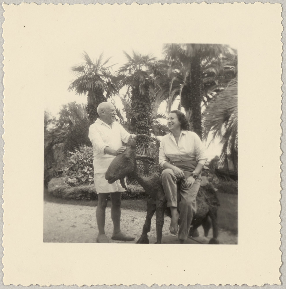 Pablo Picasso avec Maud Westerdahl assise sur "La Chèvre" dans le jardin de La Californie, Cannes