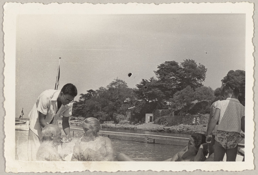 Pablo Picasso avec Maya et un ami sur la plage de la Garoupe, Cap d'Antibes, en été 1956