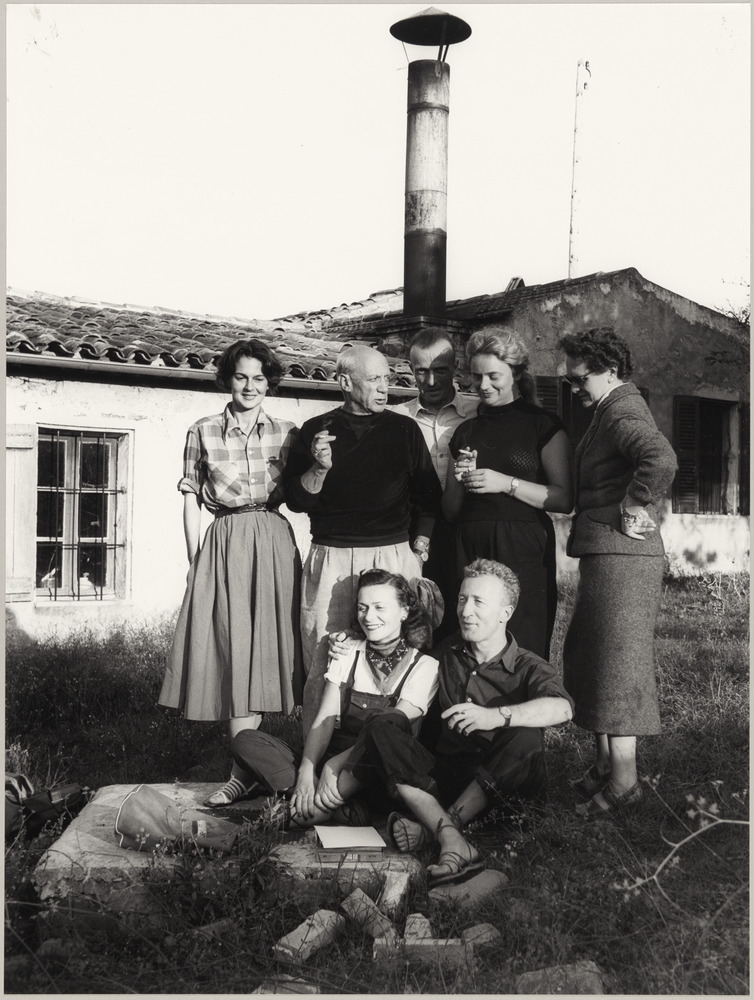 Pablo Picasso avec Michel et Louise Leiris, Claude Roy, Hélène Parmelin, Ketty et Claire Vervin, à l'atelier du Fournas, Vallauris, en septembre 1953
