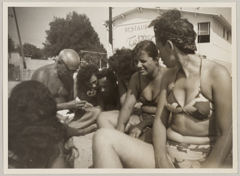 Pablo Picasso avec Michel Sima, Matsi Hatzilazarou, Paola Padani, Léna Joanidès, Christine Baunstein sur la plage de Golfe-Juan, en 1948