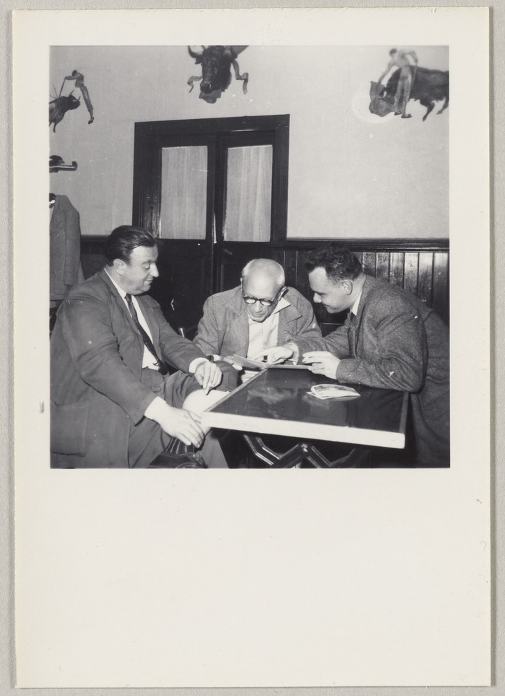 Pablo Picasso avec Paco Munoz et Pierre Bertrand regardant des photos dans un café de [Vallauris], en 1955
