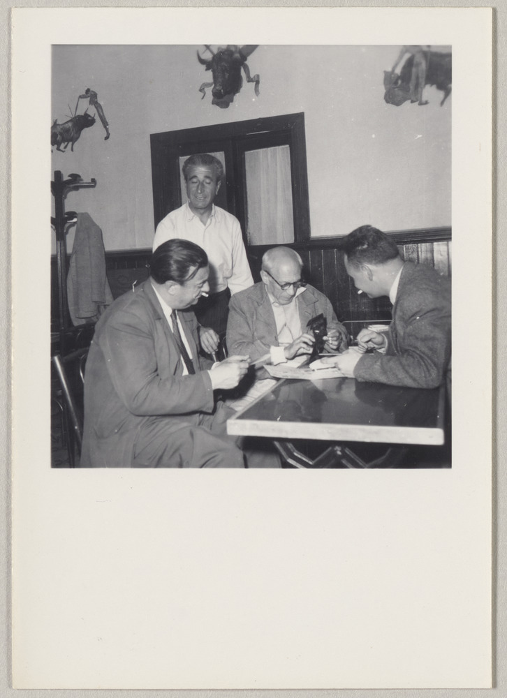 Pablo Picasso avec Paco Munoz, Pierre Bertrand et un ami dans un café de [Vallauris], en 1955
