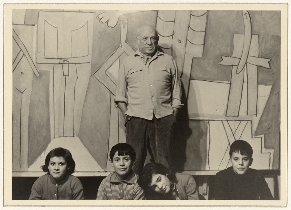 Pablo Picasso avec Paloma, Claude, Catherine Hutin et Gérard, le fils d'Inès Sassier, assis, devant "Les baigneurs à la Garoupe", à La Californie, Cannes, en 1957