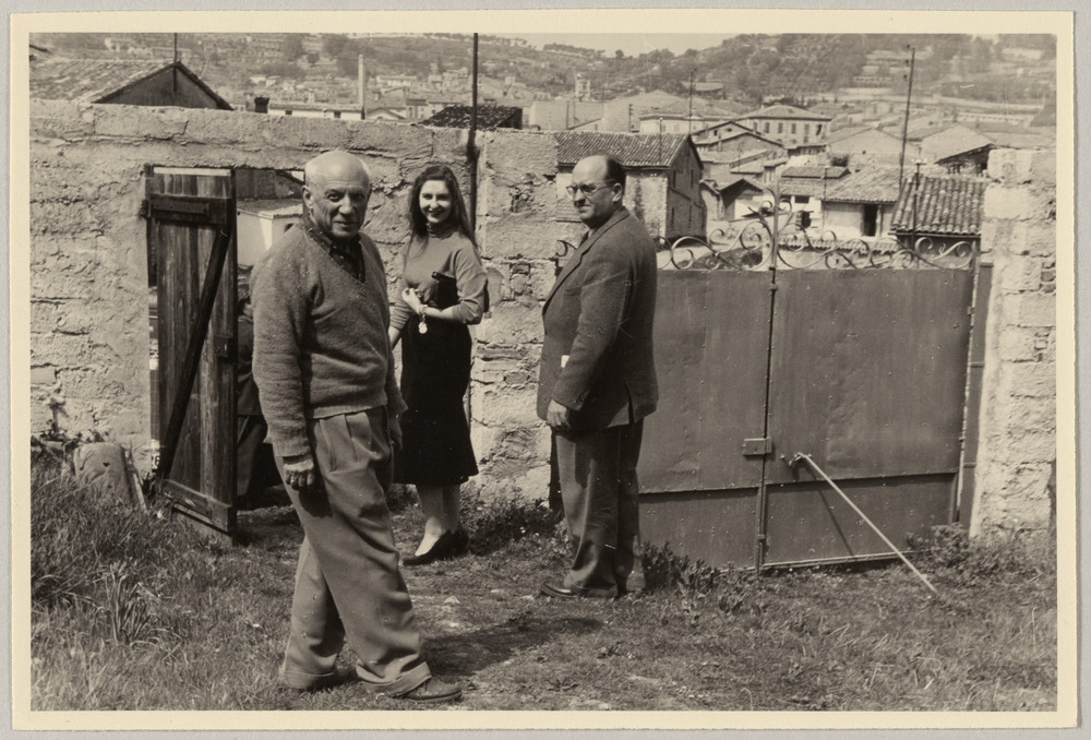 Pablo Picasso avec Pierre Cailler et sa fille Nane, dans le jardin de l'atelier du Fournas, Vallauris, entre 1952 et 1957