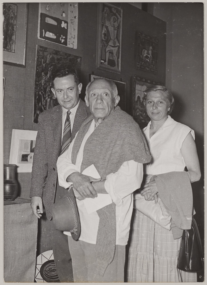 Pablo Picasso avec René et Madeleine de Valence lors du Congrès international de la céramique, Cannes, en 1955