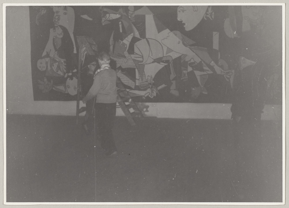 Pablo Picasso avec Romuald Dor de la Souchère devant la tapisserie de l'atelier de La Baume-Dürrbach représentant "Guernica" de Pablo Picasso et présentée au Musée Grimaldi, Antibes, en novembre 1955