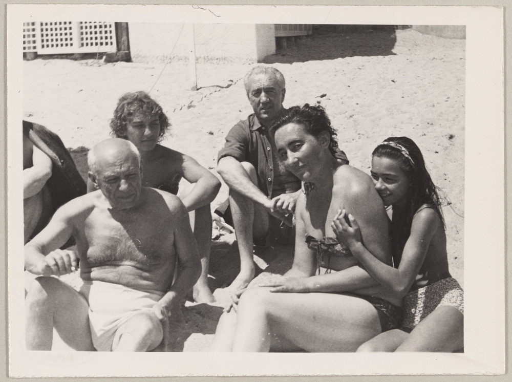 Pablo Picasso avec sa fille Maya, Manuel Ángeles Ortiz, Dominique Eluard et sa fille Caroline Lemort sur la plage de Golfe-Juan, été 1954